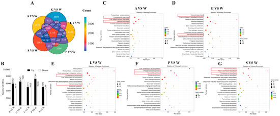 Transcriptomic assessments of flowers from Hippeastrum varieties. (A) Venn diagram of differentially expressed genes (DEGs) arising following comparison of ‘Apricot Parfait’ (“A”), ‘Grand Diva’ (“G”), ‘Luna’ (“L”), ‘Pink Rival’ (“P”), ‘Souvenir’ (“S”) vs. ‘Wedding Dance’ (“W”). (B) showed DEGs following pairwise the comparisons of ‘A’, ‘G’, ‘L’, ‘P’, ‘R’, and ‘S’ vs. ‘W’. (C–G) The KEGG enrichment analysis of DEGs. The KEGG pathways associated with phenotypic traits were marked with red boxes. Phenylpropanoid biosynthesis, flavonoid biosynthesis, flavone and flavonol biosynthesis.
