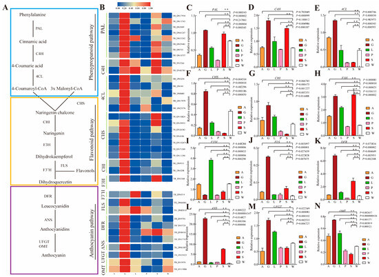 Previous research has established that PAL, C4H, 4CL are involved in core phenylpropanoid biosynthesis whilst CHI, F3H, F3′H, FLS control flavonoid biosynthesis and are EBGs (early biosynthesis genes) in the anthocyanin biosynthesis pathway. DFR, ANS, UFGT, OMT are LBGs (later biosynthesis genes), involved in the accumulation of anthocyanin (Figure 4A). FPKM values for these genes were isolated from RNA-Seq data and used to generate a heatmap (Figure 4B) and also by qRT-PCR assessment of gene expression in the petals of six Hippeastrum cultivars (Figure 4C–N). The qRT-PCR results were basically consistent with the transcriptome sequencing results.