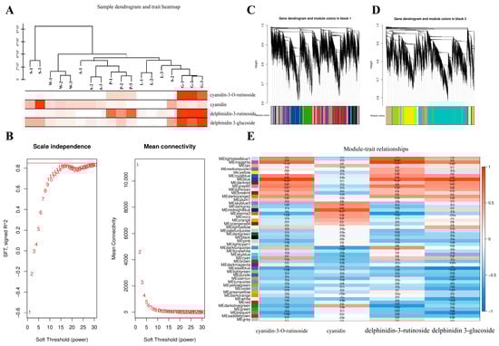 WGCNA analysis (Weighted Gene Co-expression Network Analysis) based on the RNA-Seq data and the m/z abundance of 4 compounds, cyanidin, cyanidin-3-O-rutinoside, delphinidin 3-glucoside, and delphinidin 3-rutinoside. (A) Sample dendrogram and trait heatmap. (B) Setting of the plateau threshold line and determination of soft threshold. (C,D) The detection of modules: (C) showed the gene hierarchical clustering tree based on TOM (Topological Overlap Matrix), illustrating the clustering relationships of each gene, while (D) presented the final module classification obtained by applying the dynamic tree cut algorithm, where genes were divided into modules and optimized for merging. Different colors represent distinct modules, and the gray color indicates genes that are not assigned to any other modules, with the gray module being meaningless. The vertical distance between nodes represents the distance between genes, while the horizontal distance has no significance. (E) Module–trait correlation analyses. By analyzing the correlation between traits and modules, and visualizing this relationship through a heatmap, the strength of the correlation between each module and the given trait could be clearly shown. A correlation value closer to 1 (in absolute value) suggested that the trait is likely functionally related to the genes in the module. The x-axis represents different traits, the y-axis represents different modules, and the values in the heatmap indicate the correlation strength along with the statistical significance (p-values). A correlation value closer to 1 indicates a stronger positive correlation between the module and the sample, while a value closer to −1 indicates a stronger negative correlation. Smaller p-values in parentheses indicate stronger statistical significance.
