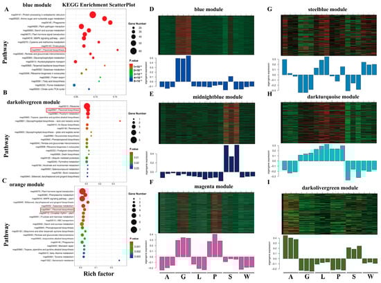 KEGG enrichment analysis identified three modules enriched in the flavonoid biosynthesis pathway: the blue, dark olive green, and orange modules (Figure 6A–C). Subsequently, we selected the modules with the strongest positive and negative correlations with discrete anthocyanins and gene expression levels in the petals of different flower varieties. The gene expression patterns were indicated by heatmaps (Figure 6D–I).