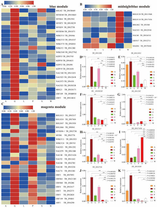 Screening of transcription factors in the three modules and validation by qRT-PCR. (A–C) The heatmap of TF genes in blue, midnight blue, and magenta modules. The color key indicates the normalized expression values of individual genes, ranging between 0 and 1. (D–K) qRT-PCR results of selected genes from three modules. ‘Wedding Dance’ used as the common comparator. All data were means (±SE) of three independent biological replicates (* p < 0.05, ** p < 0.01).