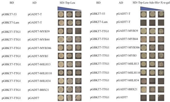 The results of the yeast two-hybrid (Y2H) experiment are presented. TTG1 did not exhibit self-activation and showed interactions with MYB transcription factors MYB39, MYB44, MYB306, and MYB3 and bHLH transcription factors bHLH13, bHLH110, and bHLH34. Moreover, the interaction was also identified between TTG1 and BBX transcription factor BBX21. Protein interactions were assessed using synthetic defined double dropout (SD DDO) medium (left) and SD quadruple dropout (SD QDO) medium with X-α-gal (right). The SD QDO medium lacks His, Leu, Ade, and Trp, while the SD DDO medium lacks Trp and Leu. The negative control consisted of pGADT7-T and pGBKT7-Lam, while the positive control involved pGADT7-T and pGBKT7-53. The three columns (from left to right) correspond to three concentration gradients (1, 0.1, and 0.01).