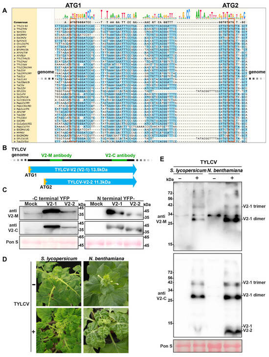 Previous report showed TYLCTHV, a begomovirus, has two in-frame AUG initiation codons within the AV2 ORF, and both of them were required for viral full virulence [32]. To investigate whether the presence of two AUG codons in the AV2 ORF is conserved among begomoviruses, we analyzed representative Begomovirus species through sequence alignments. The results revealed widespread conservation of dual initiation codons in V2 proteins across different begomoviruses (Figure 1A), suggesting the evolutionary conservation of this molecular feature and providing a foundation for functional characterization. Consistent with the previous finding in the TYLCTHV AV2 ORFs [29], the TYLCV V2 ORF also encodes two in-frame isoforms: V2-1 (the full-length isoform initiating from the first ATG, 13.5 kDa) and V2-2 (initiating from the second ATG, 11.3 kDa) (Figure 1B).