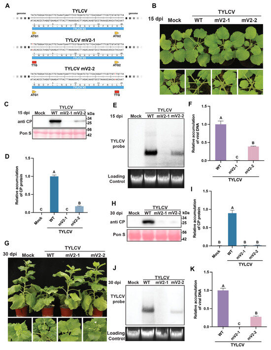 Figure 2. Infectivity analysis of TYLCV V2 mutants in N. benthamiana. (A) Schematic diagram of the construction of two V2 isoform protein deletion mutants. The blue rectangle represents the V2 coding region. The yellow arrow indicates the functional start codon (ATG). The red rectangle represents the mutated, nonfunctional start codon. The black, long-dashed line indicates the remaining genomic sequence of TYLCV. (B) Systemic symptoms of N. benthamiana plants at 15 dpi. From left to right: Mock (EV, negative control), wild-type TYLCV (WT), V2-1 knockout mutant (mV2-1), V2-2 knockout mutant (mV2-2). (C) Western blot analysis of TYLCV CP accumulation in systemic leaves of plants, shown in panel (B), Pon S staining of RbcL shows protein loading. (D) Quantification of band signal intensities from C (n = 3) using ImageJ software (version 1.53k). Statistical significance was assessed by One-Way ANOVA with Tukey’s HSD test. Columns labeled with distinct uppercase letters indicate extremely significant differences (p < 0.01). (E) Southern blot analysis of viral genomic DNA accumulation in systemic leaves sampled from plants in (B). Ethidium bromide (EB) nucleic acid staining confirmed uniform DNA loading amounts across all samples. (F) qPCR analysis of viral genomic DNA accumulation in systemic leaves sampled from plants in (B) (n = 3), normalized to the NbActin internal reference. Data normalized to the mean viral load of WT. Statistical significance was assessed by One-Way ANOVA with Tukey’s HSD test. Columns labeled with distinct uppercase letters indicate extremely significant differences (p < 0.01). (G) Systemic symptoms of N. benthamiana plants at 30 dpi. From left to right: Mock (EV, negative control), WT, mV2-1, mV2-2. (H) Western blot analysis of sustained TYLCV CP accumulation in systemic leaves, Pon S staining of RbcL shows protein loading. (I) Quantification of band signal intensities from (H) (n = 3) using ImageJ software. Statistical significance was assessed by One-Way ANOVA with Tukey’s HSD test. Columns labeled with distinct uppercase letters indicate extremely significant differences (p < 0.01). (J) Southern blot analysis of long-term viral genomic DNA replication in systemic leaves from plants in (G), EB nucleic acid staining confirmed uniform DNA loading amounts across all samples. (K) qPCR analysis of viral genomic DNA accumulation in systemic leaves from plants in (G) (n = 3), normalized to the NbActin internal reference. Statistical significance was assessed by One-Way ANOVA with Tukey’s HSD test. Columns labeled with distinct uppercase letters indicate extremely significant differences (p < 0.01).