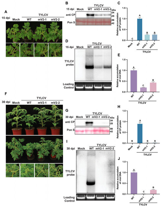 To validate the functional conservation of V2 isoforms in natural hosts, this study further evaluated the infectivity of TYLCV V2 mutants (mV2-1 and mV2-2) using tomato as the experimental system. A. tumefaciens suspensions (OD600 = 0.6) carrying EV (Mock), wild-type (WT), or mutants were infiltrated into true-leaf-stage tomato plants (8 biological replicates per treatment), with phenotypic observations and sampling conducted at 15 dpi and 30 dpi. At 15 dpi, TYLCV-WT-infected tomato plants exhibited characteristic apical leaf curling symptoms, including leaf yellowing, marginal curling, and growth retardation (Figure 3A). In contrast, both mV2-1- and mV2-2-infected groups showed no significant phenotypic differences from the Mock control, with no visible symptoms, indicating that deletion of either V2 protein severely compromises viral pathogenicity. Western blot analysis of viral CP accumulation revealed CP signal intensities reduced to 25.82% (mV2-1) and 26.29% (mV2-2) of WT levels (Figure 3B,C). Southern blot analysis further demonstrated a greater reduction in ssDNA/dsDNA replicative intermediate abundance in the mV2-1 group compared to mV2-2 (Figure 3D). qPCR quantification confirmed a 79.46% reduction in viral genomic accumulation for mV2-1 and 56.62% for mV2-2 compared to WT (Figure 3E). Notably, both mutants retained partial replication capacity in tomato (particularly mV2-2), despite significantly lower CP/viral DNA accumulation than WT, suggesting potential host factor-mediated compensation for V2 functions in natural hosts. At 30 dpi, TYLCV-WT-infected plants displayed aggravated symptoms including pronounced stunting alongside leaf curling (Figure 3F), while both mutant groups remained asymptomatic, consistent with 15 dpi observations. Quantitative Western blot showed CP levels further declining to 1.62% (mV2-1) and 1.86% (mV2-2) of WT at 30 dpi (Figure 3G,H), while Southern blot and qPCR analyses showed undetectable viral genomes for mV2-1 and merely 18.65% genomic retention in mV2-2 at the same time point (Figure 3I,J), indicating progressive impairment of viral replication/packaging efficiency over time. Compared to 15 dpi, mV2-1 and mV2-2 infectious clones-infected plants exhibited significantly reduced viral CP levels and DNA accumulation relative to wild-type TYLCV at 30 dpi—a time-dependent reduction that may suggest active host defenses selectively clearing replication-defective virions.