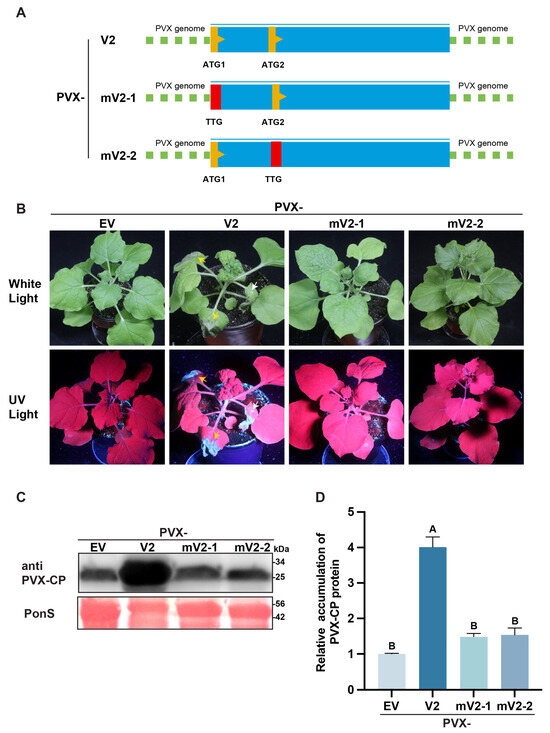 Previous results demonstrated that full-length V2 expression via the PVX vector induces necrosis in N. benthamiana [49,50,51], indicating that the V2 protein enhances PVX virulence and suppresses the immune defense in plants. To dissect the roles of two distinct translation initiation products of TYLCV V2 (V2-1 and V2-2) in potentiating PVX infection, we conducted systematic functional analyses using the PVX heterologous expression system. The V2 coding region of TYLCV was cloned and mutagenized as follows: the full-length open reading frame (ORF) from the first initiation codon (ATG1) to the stop codon was defined as V2 (full-length protein). To investigate the functional independence of the two initiation sites, site-directed mutagenesis was performed: the first initiation codon (ATG→TTG) was mutated to generate mV2-1, and the second initiation codon (ATG→TTG) was mutated to generate mV2-2. These substitutions replaced the initiator methionine (Met) with leucine (Leu), thereby abolishing translation of the corresponding viral proteins, consistent with the mutagenesis strategy for infectious clones (Figure 2A and Figure 4A). The constructs (V2, mV2-1, mV2-2) and the PVX EV control were agroinfiltrated (OD600 = 0.6) into 4–5 leaf-stage N. benthamiana plants. Phenotypic observations were conducted at 9 dpi. Results showed necrosis in both inoculated and systemic leaves of PVX-V2-infected plants, whereas no necrosis was observed in PVX-mV2-1 and PVX-mV2-2 treated groups (Figure 4B). Western blot analysis revealed significantly reduced PVX CP accumulation in PVX-mV2-1 and PVX-mV2-2-infected plants compared to PVX-V2-infected plants, indicating that both initiation products are essential for V2-mediated enhancement of the PVX CP accumulation (Figure 4C,D). These results collectively demonstrate that V2-dependent potentiation of PVX-induced necrosis requires the cooperative functions of both V2-1 and V2-2.