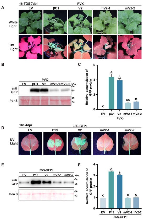 Given the established roles of V2-1/V2-2 in TGS suppression, parallel analysis of PTGS suppression was conducted using the 16c transgenic N. benthamiana system. Constructs (V2, mV2-1, mV2-2), negative control (EV), and positive control (P19) were co-infiltrated (1:1 ratio) with 35S-GFP-carrying A. tumefaciens into 4–5 leaf-stage 16c N. benthamiana. Fluorescence phenotyping and western blot analysis were performed at 4 dpi. Fluorescence results (Figure 5D,E) and quantification analyses (Figure 5F) showed that P19 (positive control) induced strong GFP fluorescence via PTGS suppression. V2 exhibited comparable fluorescence to P19, confirming robust PTGS suppression. However, mV2-1 and mV2-2 groups showed significantly reduced fluorescence, indicating that both isoforms are critical for full PTGS suppression activity. In conclusion, phenotypic and molecular analyses demonstrate that V2-mediated PTGS suppression requires synergistic contributions from both V2-1 and V2-2, with neither isoform being dispensable.