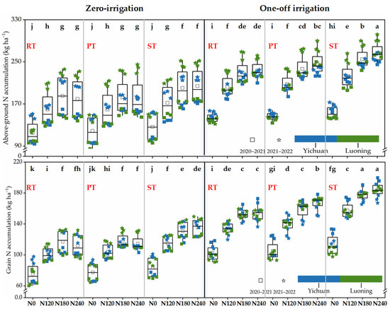 Figure 5. Effects of different treatments on grain and above-ground N accumulation of wheat from 2020 to 2022. I0, zero irrigation; I1, one-off irrigation; RT, rotary tillage; PT, plowing; ST, subsoiling. N0, N120, N180, and N240 represent the N management with N application rates of 0, 120, 180, and 240 kg N ha−1, respectively. The top and bottom of the box refer to the third and first quartiles, respectively, and the line inside the box is the median. The height of the box refers to the interquartile range. Different lowercase letters above the box show the significant differences at p < 0.05 (by Duncan’s test) among treatments, and when there are more than two lowercase letters in the figure, only the first and last letters are retained.