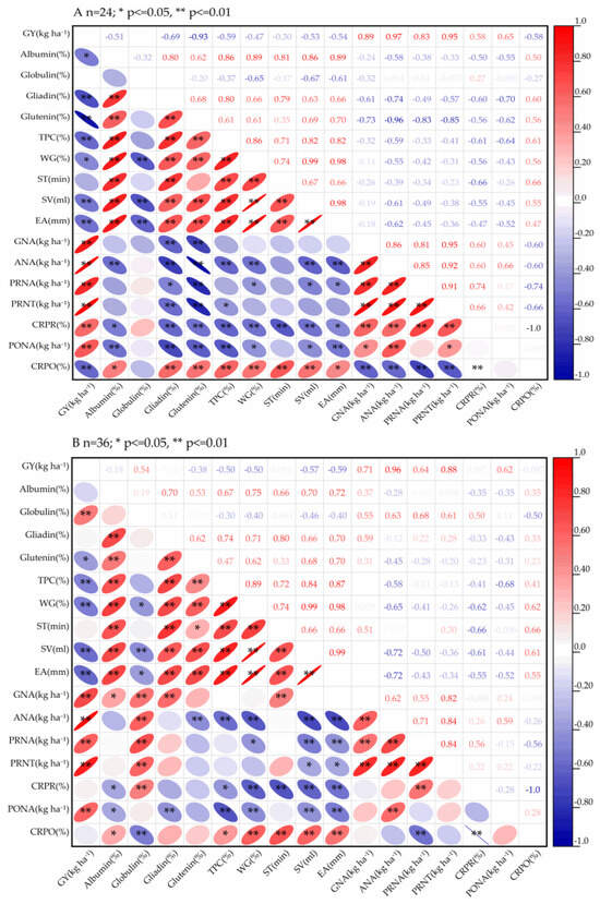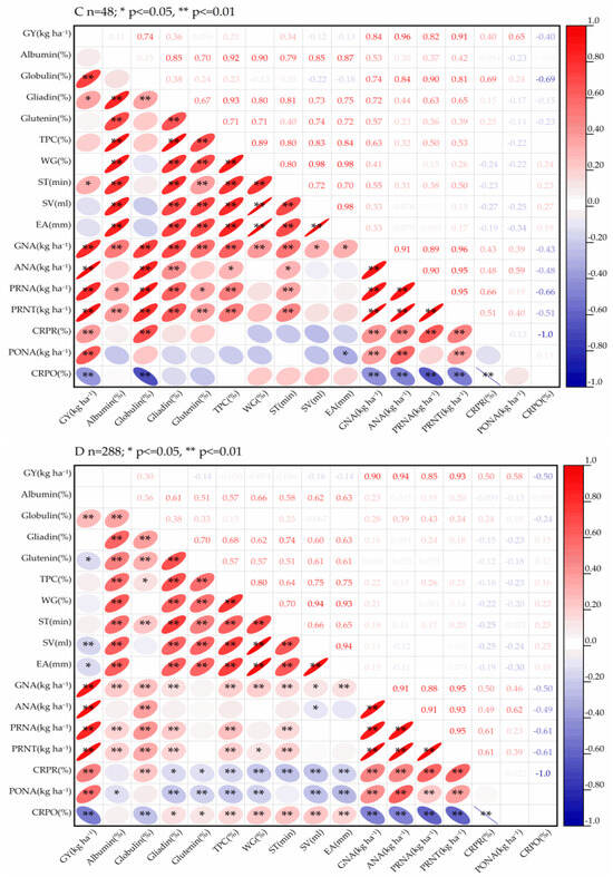 Figure 7. The correlation analysis of grain yield, quality and N accumulation at maturity of wheat under different irrigation practices (A), tillage methods (B), N management methods (C), and their combinations (D). GY, TPC, WG, ST, SV, EA, GNA, ANA, PRNA, PRNT, CRPR, PONA, and CRPO refer to grain yield, total protein content, stability time, wet gluten content, sedimentation value, extensibility, grain N accumulation, above-ground N accumulation, pre-anthesis N accumulation, pre-anthesis N translocation, contribution rate of pre-anthesis N translocation to grain N, post-anthesis N accumulation, and contribution rate of pre-anthesis N accumulation to grain N, respectively. * and ** indicate significant correlation at p < 0.05 and p < 0.01, respectively.