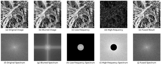 Schematic diagram of the frequency domain reconstruction process analysis (from left to right: original image and spectrum → blurred image (high frequencies missing) → low-frequency reconstruction (structure preserved but details lost) → high-frequency reconstruction (details recovered accompanied by noise) → fusion result (high and low frequencies proportionally balanced)). All spectra are processed by a logarithmic transformation to enhance the visualization contrast.