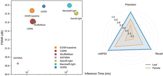 Figure 3. In this study, the method performance is verified by a two-dimensional evaluation system: the left figure compares the resource efficiency of the lightweight method under the 4× super-resolution task (the bubble area indicates the GPU memory occupancy, and the horizontal and vertical axes indicate the inference time and PSNR, respectively), and the right figure quantifies the accuracy gain of the super-segmented image for the downstream task, with the blue color corresponding to rice spike ripeness detection and the shape figure corresponding to leaf pest detection, where the solid line indicates the recovered performance boundaries, and the dashed line indicates the original performance boundaries.