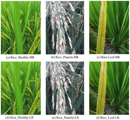 As shown in Figure 5, the two key downstream task datasets used in this study and their super-resolution requirements are as follows: the Rice Disease Detection Dataset [25] contains 6715 training images for accurate identification of rice bacterial leaf spot, brown spot, and leaf mold. Bacterial leaf spot leaves show watery spots, brown spots reduce photosynthetic efficiency, black spots of leaf mold are degraded at multiple scales, low-frequency areas of large-scale spots are degraded with fuzzy edges, and detailed areas of small-scale spots are susceptible to texture loss [26]. The accuracy of this dataset depends on the morphological integrity and color fidelity of the rice spike and is susceptible to frequency-domain aliasing and structural distortion at a low resolution.