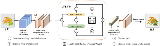 In rice image restoration, low-frequency information, such as global leaf region stripe and pest distribution, and high-frequency information, such as detail region rice spike hierarchy, are coordinately associated, which together constitute the complete image features, and the existing restoration methods often neglect this coordinated connection, resulting in texture blurring and contour offset problems. Relevant studies have shown that the potential of image processing can be fully exploited through the dual-branch multi-frequency structure. For example, methods such as DB-MFENet [21] and SMFANet [22] effectively improve the performance of the model by enhancing the low-frequency and high-frequency features separately through frequency division processing. By decomposing image features into low-frequency and high-frequency parts and enhancing them separately, this structure can fully utilize both global and local information, thus achieving better image processing results. In order to solve the above problems, a lightweight module for adaptive dynamic feature adjustment is proposed in this paper. The module optimizes the global and local information through low-frequency and high-frequency branches, respectively, and combines the dynamic adaptive fusion method with the feedforward network to realize the precise fusion of information and the dynamic adjustment of frequency so as to achieve high-quality image reconstruction.