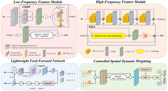 In recent years, deep-learning-driven image processing techniques have shown significant advances, among which convolutional neural network (CNN)-based methods have demonstrated unique advantages in the processing of high-frequency information in images [6,7]. CNN can efficiently extract the local texture and edge features of an image through a multilayer convolutional structure, and their parameter sharing mechanism and hierarchical feature extraction capability make them perform. Its parameter-sharing mechanism and hierarchical feature extraction capability make it excel in detail-recovery tasks. However, due to the limitation of local sensory fields, CNN is difficult to model global dependencies across regions, which leads to obvious deficiencies in the global contextual understanding of low-frequency information. In contrast, the Transformer-based [8] model achieves the modeling of global dependencies through the self-attention mechanism [9,10], and its theoretical receptive field can cover the whole map range, which has a significant advantage in the integration of low-frequency information (e.g., light distribution and overall structure). However, this global focus characteristic also leads to its lack of sensitivity to local high-frequency details (e.g., texture mutation regions), and the Transformer model has a systematic flaw in its ability to capture the spectrum of high-frequency components. In order to balance the advantages of the two architectures, hybrid models such as TCSR [11] try to combine the local feature extraction module of CNN with the global attention of the Transformer, but experiments show that it still suffers from insufficient adaptation during channel feature fusion, leading to artifacts or blurring when high-frequency details are recovered.