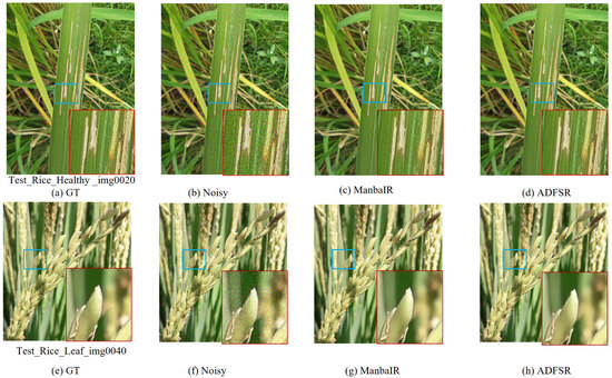 To evaluate the performance of our model on denoising performance and to ensure the fairness of the experiments, we adopted the lightweight network architecture of MambaIR-light [19] and performed the same number of rounds of training. During the experiment, we strictly followed the established methodology for each round of processing. As shown in Table 3, we compared the metrics on the Rice_Healthy and Rice_Leaf datasets. The visual comparison in Figure 8 further visualizes the performance of our approach in terms of detail presentation and overall quality. This result is mainly attributed to the dual-frequency processing strategy we employ, as well as the application of the dynamic weight fusion mechanism (CSDW) and the lightweight gating network (LFFN). These techniques enable the model to process the high-frequency information more efficiently during the frequency information fusion process, thus achieving better denoising results.