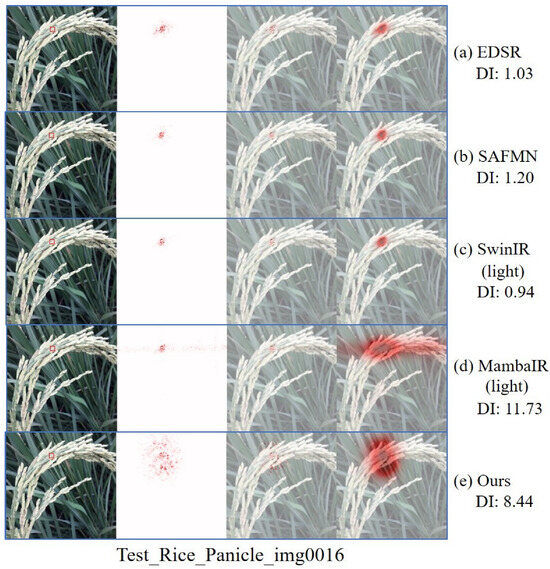 In subjective image comparisons (shown in Figure 9), the ADFSR method shows significant advantages in detail preservation and overall visualization. Compared to conventional methods (e.g., CARN and EDSR), hybrid architectures (e.g., ShuffleMixer and SAFMN), visual Transformer-based methods (SwinIR-light), and methods based on improved Mamba architectures (MambaIR-light), ADFSR is able to recover texture details more efficiently while preserving the edge clarity and image naturalness. In complex texture regions, ADFSR retains more high-frequency details, reduces blurring and artifacts, and provides a clearer and more realistic visual effect. For example, in the area of small speckle details of rice leaves, ADFSR shows superior visual effects, while other methods show blurring and diffusion. In the low-frequency region of the leaf blade, other methods are excessively smooth and have distorted details, especially in the stripe performance of the rice leaf blade, and ADFSR is able to highlight the stripe details more, showing stronger robustness and detail recovery.