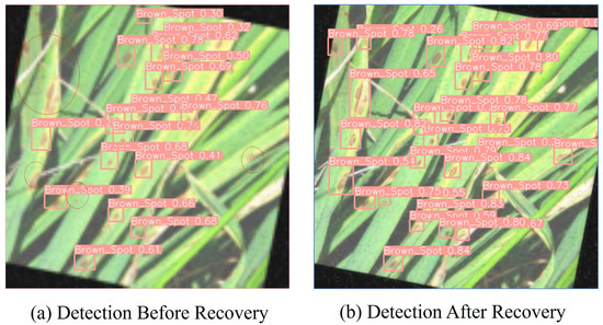 The comparative results of target detection are shown. After image recovery, the detection accuracy is improved. The red circle identifies the missed detection part of the unrecovered area. The figure originates from the pest and disease dataset (0100.png).