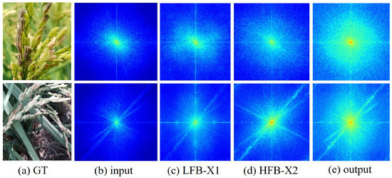 In order to verify the complementarity of high-frequency detail information and low-frequency global structure information during image degradation, we conducted experiments based on the test model by removing the high-frequency branch (HFB-) or the low-frequency branch (LHB-), as well as replacing the original structure with a double-high-frequency branch (HFB ×2) or a double-low-frequency branch (LFB ×2), and leaving the other model structures unchanged, respectively. The experimental results show that a reasonable combination of high-frequency and low-frequency information can significantly improve the performance of the model in the rice-image-processing task, verifying the effectiveness of the complementary combination of high and low-frequency information. As shown in Figure 12, by comparing the visual effects of different structural adjustments (including removing or doubling the high-frequency/low-frequency branches) with contrast enhancement processing (enhancement factor of 2) to highlight the texture details, the results show that the original two-branch model performs optimally in the recovery of texture details, which further proves the importance of the combination of high and low-frequency information.