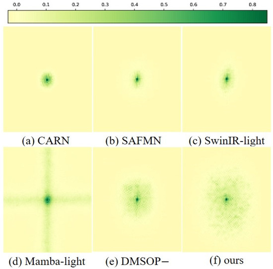 According to the quantitative analysis of the local attribute map (LAM) [33], the results show (as shown in Figure 10) that there is a significant spatial correlation feature between the red pixel region and the rectangular location block. The ADFSR method significantly outperforms existing methods in non-local information capture. Traditional CNN methods are limited by the local perceptual field and have insufficient diffusion ability; Transformer-based methods have a global attention mechanism but have limited ability to recover high-frequency details; MambaIR has a breakthrough in long-sequence modeling but has a too high computational cost; ADFSR breaks through the bottleneck of local perceptualization by dynamically constructing asymmetric diffusion paths and realizes a larger range of pixel-length dependencies. The LAM visualization results show that ADFSR can realize cross-scale feature interaction, which is better than the limited neighborhood association of the comparative methods, is especially suitable for high-frequency detail reconstruction of complex texture regions, and avoids the problem of a high computational cost.