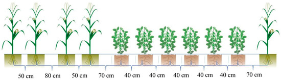 The experiment was conducted over two years in wheat–maize–soybean rotation fields, spanning the 2022–2023 and 2023–2024 growing seasons. Maize and soybeans were alternately planted, with four rows of maize followed by four rows of soybeans. The maize variety was Denghai 605, which has 19–20 leaves in total, and the 13th or 14th leaf is the ear leaf, a plant height of 259 cm, an ear height of 99 cm, and a growth period of 101 days. The soybean variety was Weidou 20, which has 0.9 effective branches and 14.1 main stem nodes, a plant height of 53.14 cm, and an average growth period of 105 days. The planting densities were 67,500 plants/hm2 for maize and 120,000 plants/hm2 for soybeans. In this study, corn and soybeans were sown together (Figure 1) with fertilizer and equipped with drip irrigation machines. During sowing, 750 kg/hm2 compound fertilizer (N:P2O5:K2O = 15:15:15) was applied in the corn planting area, and 211 kg/hm2 nitrogen fertilizer (N = 46%) was applied during the large ear stage of corn; 150 kg/hm2 compound fertilizer (N:P2O5:K2O = 15:15:15) was applied in the soybean planting area. Pest and disease control after emergence was the same as that in ordinary production fields. The experiment was set up as a completely randomized block design, with each treatment having three repetitions. The control treatment (CK) was water, and the two PGRs were EC with the main active ingredients of ethephon (300 mg/L) and cycocel (2 g/L) (T1), and ED with the main active ingredients of ethephon (300 mg/L) and 2-Diethyl aminoethyl hexanoate (10 mg/L) (T2). The concentration of plant growth regulators was based on the research by Ren et al. [29]. Each experimental plot had a width of 1.6 m and a length of 20 m. The PGRs were evenly sprayed onto the surfaces of maize leaves at an application dose of 450 L/hm2 during the 7th leaf stage [29], between 16:00 and 19:00. In the optimal application technique, the aim was to make the leaf surfaces moist but without dripping. The sowing date and field management practices adhered to local customs. After the wheat harvest, crop residues on the ground were crushed into fragments no larger than 10 cm. Subsequently, the soil was tilled to a depth of 0–15 cm using a rotary tiller to loosen the soil and promote the decomposition of the aboveground residues.