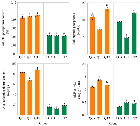 Soil total phosphorus content, soil organic phosphorus content, available phosphorus content, and alkaline phosphatase (ALP) activity in crop rotation systems under three treatments. QCK: control treatment (water) in Qihe; QT1: treatment with ethephon (300 mg/L) and cycocel (2 g/L) in Qihe; QT2: treatment with ethephon (300 mg/L) and 2-Diethyl aminoethyl hexanoate (10 mg/L) in Qihe; LCK: control treatment (water) in Laizhou; LT1: treatment with ethephon (300 mg/L) and cycocel (2 g/L) in Laizhou; LT2: treatment with ethephon (300 mg/L) and 2-Diethyl aminoethyl hexanoate (10 mg/L) in Laizhou. The same letters above the bars in a subfigure indicate no significant difference according to the least significant difference test (p < 0.05).
