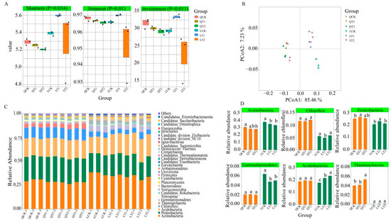 Comparison of metagenomic sequencing data under different treatments in maize strips in intercropping systems. (A) Differences in Shannon index, Simpson index, inverse Simpson index under different treatments. (B) Principal coordinates analysis (PCoA) of different treatments based on Bray–Curtis distances among metagenomic profiles. (C) Relative abundances (%) of major bacterial phyla in rhizosphere microbial communities. (D) Bacterial phyla with significantly different (p < 0.05) abundances in soils among different treatments. Bars with different letters are significantly different (p < 0.05).