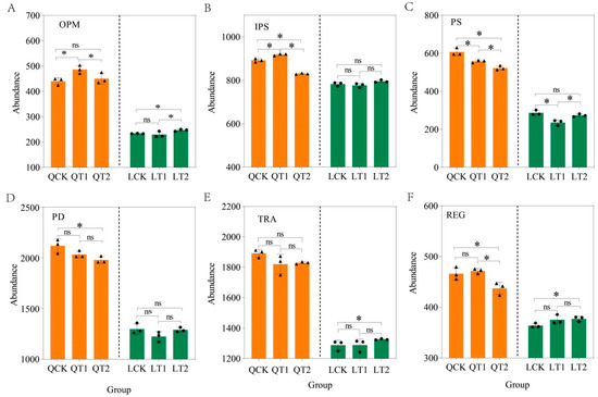 Relative abundances of phosphorus cycling genes at the function level in maize strips in intercropping systems. QCK: control treatment (water) in Qihe; QT1: treatment with ethephon (300 mg/L) and cycocel (2 g/L) in Qihe; QT2: treatment with ethephon (300 mg/L) and 2-Diethyl aminoethyl hexanoate (10 mg/L) in Qihe; LCK: control treatment (water) in Laizhou; LT1: treatment with ethephon (300 mg/L) and cycocel (2 g/L) in Laizhou; LT2: treatment with ethephon (300 mg/L) and 2-Diethyl aminoethyl hexanoate (10 mg/L) in Laizhou. (A) represents: organic phosphorus mineralization (OPM); (B) represents inorganic phosphorus solubilization, (IPS); (C) represents polyphosphate synthesis, (PS); (D) represents polyphosphate degradation, (PD); (E) represents transporters, (TRA); (F) represents regulatory functions, (REG). Asterisks indicate significant differences according to the least significant difference test (p < 0.05), ns indicate no significant difference test (p < 0.05).