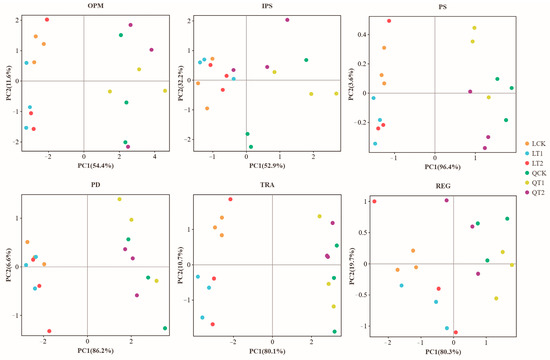 Principal component analysis of phosphorus cycling genes in maize and soybean intercropping systems under treatment with different growth regulators. OPM: organic P mineralization; IPS: inorganic P solubilization; REG: regulatory; TRA: transporters; PD: polyphosphate degradation.