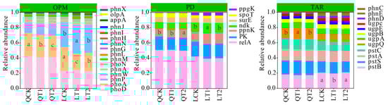 Relative abundances of phosphorus cycling genes in maize strips in intercropping systems. QCK: control treatment (water) in Qihe; QT1: treatment with ethephon (300 mg/L) and cycocel (2 g/L) in Qihe; QT2: treatment with ethephon (300 mg/L) and 2-Diethyl aminoethyl hexanoate (10 mg/L) in Qihe; LCK: control treatment (water) in Laizhou; LT1: treatment with ethephon (300 mg/L) and cycocel (2 g/L) in Laizhou; LT2: treatment with ethephon (300 mg/L) and 2-Diethyl aminoethyl hexanoate (10 mg/L) in Laizhou. OPM: organic P mineralization; PD: polyphosphate degradation; TRA: transporters. Different lowercase letters indicate significant differences between treatments according to the least significant difference test (p < 0.05).