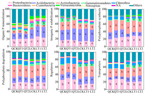 Relative contributions of phyla to phosphorus cycling genes. QCK: control treatment (water) in Qihe; QT1: treatment with ethephon (300 mg/L) and cycocel (2 g/L) in Qihe; QT2: treatment with ethephon (300 mg/L) and 2-Diethyl aminoethyl hexanoate (10 mg/L) in Qihe; LCK: control treatment (water) in Laizhou; LT1: treatment with ethephon (300 mg/L) and cycocel (2 g/L) in Laizhou; LT2: treatment with ethephon (300 mg/L) and 2-Diethyl aminoethyl hexanoate (10 mg/L) in Laizhou. NA: not available. Different lowercase letters indicate significant differences between treatments according to the least significant difference test (p < 0.05).