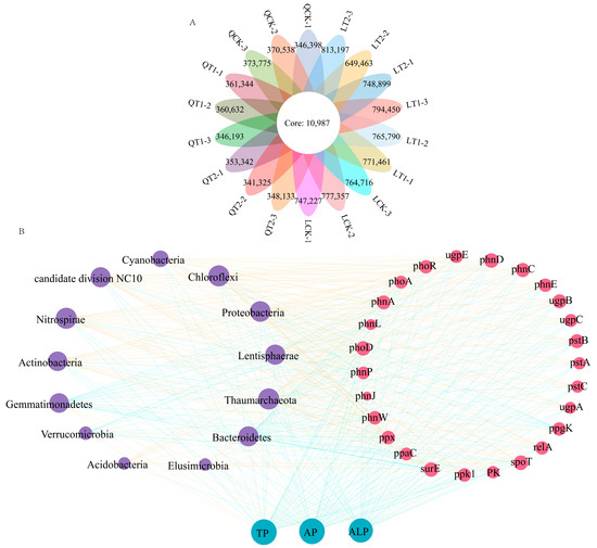 Venn diagram showing rhizosphere-enriched bacterial operational taxonomic units (OTUs) in soils under three field treatments at Qihe and Laizhou (A). Network depicting relationships among crop systems, abundances of phosphorus cycling genes, soil available phosphorus content, total phosphorus content, and soil alkaline phosphatase activity (B).