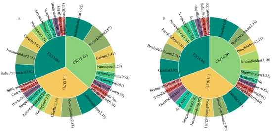 Circos diagram showing microbial communities at the genus level, illustrating the taxonomic differences between soils under CK, T1, and T2 in Qihe (A) and Laizhou (B). The width of each ribbon corresponds to the relative abundance of each taxon. CK: control treatment (water); T1: treatment with ethephon (300 mg/L) and cycocel (2 g/L); T2: treatment with ethephon (300 mg/L) and 2-Diethyl aminoethyl hexanoate (10 mg/L).