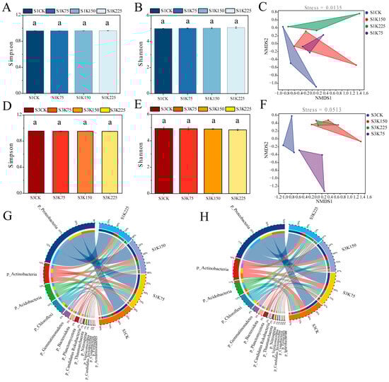 The changes in microbial diversity and composition in different soil layers under varying rates of potassium fertilizer application; (A,B) display the Simpson index and Shannon index, respectively, for microorganisms in the topsoil; (D,E) show the same indices for the deep soil layer. The composition of microorganisms in the topsoil and deep soil layer under different potassium sulfate gradients is illustrated (C,F), respectively, using a circos plot. (G,H) Depiction of the results of NMDS analysis for the topsoil and deep soil layers. Different lowercase letters indicate statistically significant differences between treatments (p < 0.05), using one-way ANOVA, followed by Duncan’s multiple range test (p < 0.05).