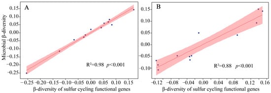 The β-diversity of microbial community structure exhibited a strong positive correlation with functional gene diversity in the topsoil and in the deep soil layer, indicating consistent co-variation across soil depths (Figure 2A,B). In the surface soil, the regression analysis yielded a slope of 0.92 and a coefficient of determination (R2) of 0.98, indicating a strong linear relationship and high consistency between the variables. In the deep soil, although the correlation remained statistically significant (p < 0.001), a lower regression slope of 0.85 and a reduced R2 of 0.88 were observed, along with a broader fitting band, suggesting slightly reduced consistency and greater data dispersion.