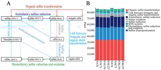 To comprehensively explore the involvement of functional genes in the sulfur cycle, processes were categorized into three mechanistic groups according to changes in sulfur valence states and molecular forms [23]: (1) organic sulfur conversion, which includes organic sulfur transformation and organic-inorganic sulfur exchange; (2) sulfur reduction, comprising dissimilatory and assimilatory sulfate reduction as well as general sulfur reduction; and (3) sulfur oxidation, covering both classical oxidation reactions and the SOX pathway. Gene annotation and functional classification were conducted using curated information from the KEGG, MetaCyc, and UniProt databases [40,41,42].