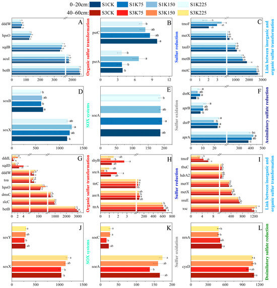Changes in sulfur cycle genes in different soil layers under different potassium fertilizer application rates (A–L). Different lowercase letters indicate statistically significant differences between treatments (p < 0.05), as determined by one-way ANOVA followed by Duncan’s multiple range test.