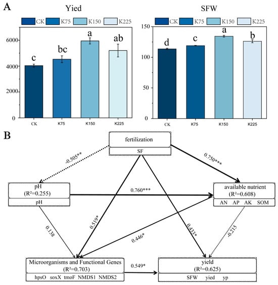 PLS−PM analysis of available nutrients, pH, microorganisms and functional genes, yield indicators in different potassium fertilizer treatments and their effects on yield (A,B). Different lowercase letters indicate statistically significant differences between treatments (p < 0.05), as determined by one-way ANOVA followed by Duncan’s multiple range test. * p < 0.05, ** p < 0.01, *** p < 0.001.