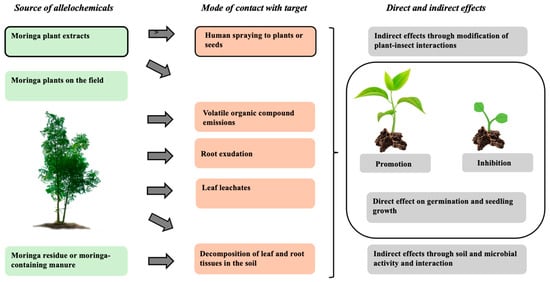 Moringa plant extracts (MPE) are often used to investigate how allelochemicals affect the growth and development of other plants. Results have demonstrated that both positive and negative impacts exist [,]. This dual allelopathic effect of moringa must be taken into consideration before introducing the plant into new environments especially when integrating it into an existing farming system, a new ecological range, or considering its use in cropping systems through extract-based interventions. This review consolidates current knowledge of moringa allelopathy by focusing on the impacts of moringa allelochemicals on various cultivated and non-cultivated plant species. It further seeks to identify knowledge gaps for future research.