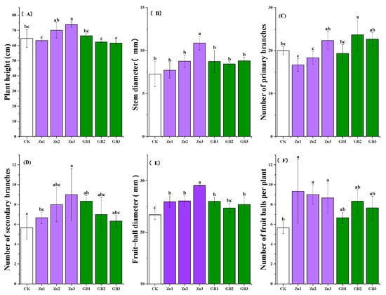 (A) plant height, (B) stem diameter, (C) number of primary branches, (D) number of secondary branches, (E) fruit-ball diameter, and (F) number of fruit balls per plant of safflower at full flowering stage under application of Zn or glycine betaine. Different lowercase letters indicate significant differences according to the Tukey test at the 0.05 level for each treatment; vertical bars in each mean indicate standard errors.