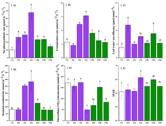 (A) net photosynthetic rate, (B) transpiration rate, (C) leaf water-use efficency, (D) stomatal conductivity, (E) intercellular CO2 concentration, and (F) chlorophyll relative content (SPAD) of safflower at full-bloom stage under application of Zn or glycine betaine. Different lowercase letters indicate significant differences according to the Tukey test at the 0.05 level for each treatment; vertical bars in each mean indicate standard errors.