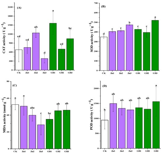 (A) catalase (CAT) activity, (B) superoxide dismutase (SOD) activity, (C) malondialdehyde (MDA) activity, and (D) peroxidase (POD) activity at full-bloom stage of safflower under application of Zn or glycine betaine. Different lowercase letters indicate significant differences according to the Tukey test at 0.05 level for each treatment; vertical bars in each mean indicate standard errors.
