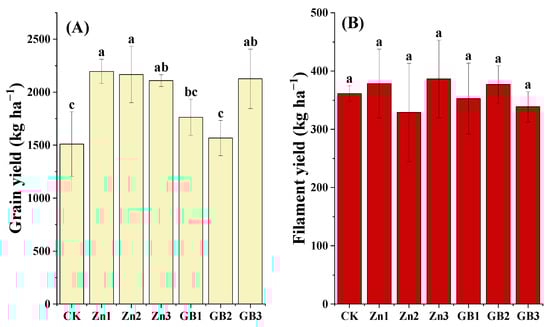 (A) grain yield and (B) filament yield of safflower under application of Zn or glycine betaine. Different lowercase letters indicate significant differences according to the Tukey test at 0.05 level for each treatment; vertical bars in each mean indicate standard errors.