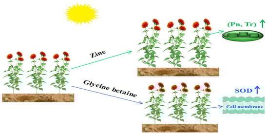 Physiological mechanism by which zinc or glycine betaine increases safflower yield. Pn: net photosynthetic rate, Tr: transpiration rate, SOD: superoxide dismutase.