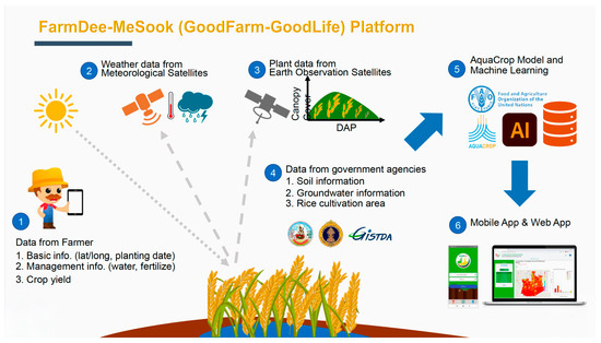 From Figure 1, it can be seen that all users must first register with the platform via the mobile application. Registration ensures authentication and enables the creation of individual “projects,” which represent farm plots cultivated under uniform practices. For each project, users provide basic inputs such as geolocation, rice variety, and planting date. These inputs initialize simulations using the AquaCrop model.
