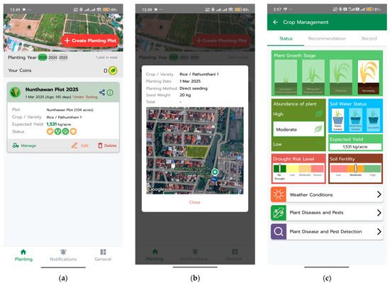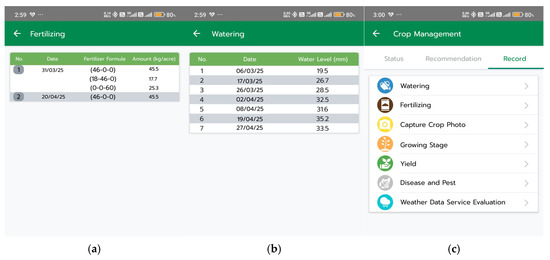 Farmdee-Mesook mobile application interface (continued): (a) fertilizer recommendation tool; (b) irrigation scheduling assistant; and (c) feedback form for submitting field data used to improve simulation accuracy.