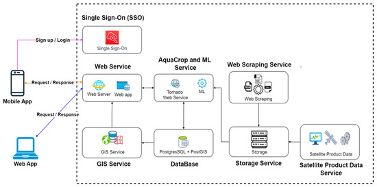 System architecture of the Farmdee-Mesook platform, comprising integrated services such as user authentication, web and GIS services, AquaCrop execution, data scraping, and satellite data processing.