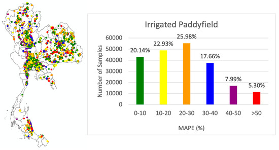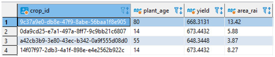To validate the reliability and scalability of the platform across diverse agroecological zones, the performance of the AquaCrop simulations was evaluated using the calibrated dataset. Simulations were separated into two categories: rainfed (500,518 plots) and irrigated (213,080 plots), corresponding to Thailand’s 22.7% irrigated land coverage. For each category, yield simulations were compared to actual reported values using the Mean Absolute Percentage Error (MAPE). These dataset and simulation results were collectively structured and stored in the database, as shown in Figure 5 and Figure 6.