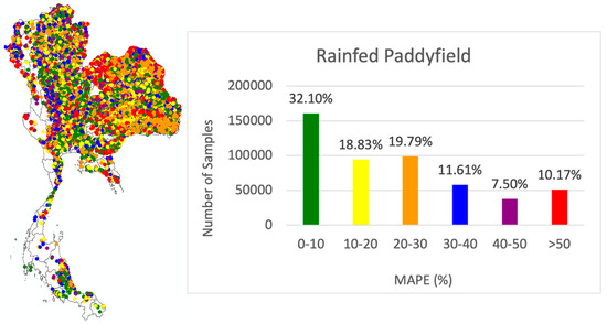 Results shown in Figure 7 and Figure 8 indicate that over 70% of simulated plots achieved an MAPE below 30%, with an average MAPE of 24.73% across all samples. Spatial analysis revealed consistent model performance across major rice-growing provinces. However, higher errors were noted in fields lacking weed management data, as weed coverage was assumed to be zero. This simplification likely resulted in an overestimation of yields in affected areas.