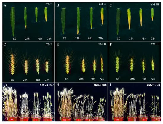 Plant morphology of wheat sown on different dates under low-temperature stress (leaf photographed on 20 April, ear and plant photographed on 18 May 2019). (A–C) shows the flag leaves of wheat sown on the date I, II, and III after the different low-temperature duration. (D–F) shows the ears of wheat sown on different dates under early spring low temperature stress. (G–I) shows the wheat plants obtained after different sowing periods and subjected to low-temperature treatment for 0 h, 24 h, 48 h, and 72 h.