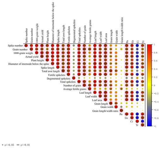 Correlation analysis among the agronomic traits, leaf photosynthetic parameters, and yield components.